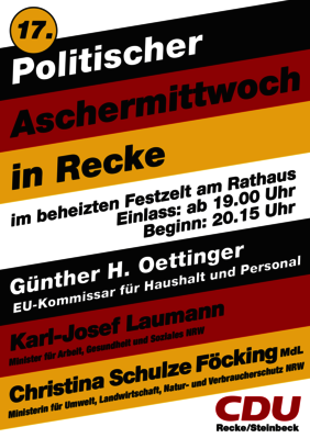 OCHTRUP/STEINFURT - Am 14. Februar 2018 findet in Recke der 17. Politische Aschermittwoch des CDU-Kreisverbandes Steinfurt statt. Ausrichter ist die CDU-Ortsunion Recke/Steinbeck. Auf den vielen Veranstaltungen in den vergangenen Jahren hatte es bei den sehr prominenten Rednern jeweils ein volles Haus gegeben.