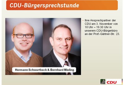 Alle interessierten Bürgerinnen und Bürger sind herzlich eingeladen, mit Hermann Schwartbeck und Bernhard Mieling in der Zeit von 18 - 19.30 Uhr über die Themen der Kommunalpolitik sowie über Probleme, Fragen und auch Anregungen der aktuellen CDU Politik…