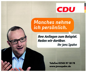 Unter dem Motto "Wahlkampf hautnah" hat Jens Spahn in den letzten Wochen bereits viele gute Gespräche mit den Bürgern in seinem Wahlkreis führen dürfen. Wenn auch Sie Interesse an einem Gespräch mit Jens Spahn haben, greifen Sie direkt zum Telefon (0 25 61 / 97 18 78) und vereinbaren einen Termin mit Jens Spahn.