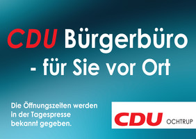 Am Sonntag, 30. Oktober eröffnet die CDU Ochtrup im Rahmen des Pottbäckermarktes das neue Bürgerbüro an der Bahnhofstraße 26. Ab 13:30 Uhr wird das Büro mit einer kleinen Feier durch die Vertreter der Ochtruper Kirchengemeinden eingeweiht. Im Anschluß sind alle Bürgerinnen und Bürger eingeladen, das Büro zu besuchen und mit den Mitgliedern der CDU über die aktuelle Kommunalpolitik zu diskutieren.