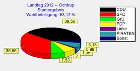 Die Wahlbeteiligung lag in Ochtrup mit 63,2 % um 1,3 % höher als bei der letzten Landtagswahl (61,9%), somit war die Wahlbeteiligung entgegen dem Landestrend noch über der Marke von 60 %.