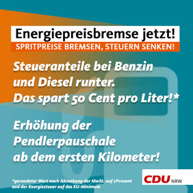 Die Spritpreise erreichen täglich neue Höchststände. Was die Pendlerinnen und Pendler bereits heute spüren, erleben wir alle bald auch bei den Heizkosten. Auch eine warme Wohnung darf kein Luxus sein. Deshalb fordert die CDU NRW vom Bund eine Energiepreisbremse.