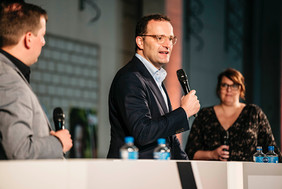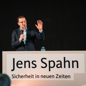 Als Höhepunkt der Veranstaltung durften Andrea Eiling und Stefan Pelster anschließend den Bundesgesundheitsminister Jens Spahn ankündigen. Mit viel Applaus betrat er die Bühne und zeigte sogleich, warum er für den Wahlkreis kandidiert. „Ich möchte in Berlin zeigen, dass die ländlichen Regionen kein abgehängter Raum sind“. Auch wenn bei der Pandemiebekämpfung Fehler passiert sind ist Jens Spahn dennoch der Überzeugung, dass Deutschland durch den Zusammenhalt Vieler gut durch die Coronapandemie gekommen ist. Im Dialog wurde deutlich, dass Jens Spahn die Sorgen der Anwesenden ernst nahm. Auf eine Frage bezüglich der Verbesserung der Situation der Pflegekräfte in Deutschland antwortete er, dass zwar bereits durch Abschaffung der Pflegepauschale, Erhöhung der Auszubildendenvergütung auf 1.000 € und zahlreichen anderen Maßnahmen ein erster Weg aus dem Pflegenotstand geschaffen wurde, aber in den Folgejahren noch einige Hürden anstünden und dieser Prozess noch dauernd würde. Konkret würde im nächsten Schritt beispielsweise die Altenpflege tarifgebunden. Weitere Anliegen, die ihn beschäftigen sind Klima und Wirtschaft nicht gegeneinander auszuspielen, sondern anstatt durch Verbote und Anordnungen den Klimaschutz durch Technologieentwicklung voranzuschreiten. „Wir haben alle ein Ziel. Nur der Weg ist anders. Ich möchte nicht das Fliegen verbieten. Ich möchte das Fliegen CO2-neutral gestalten durch Wasserstofftechnik.“
