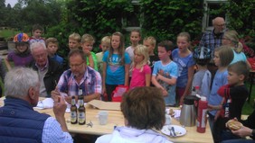Die Frageroute fand nach knapp zweieinhalb Stunden, aufgelockert durch eine von Ferdi Bäumer vorbereitete Kuchenpause an einem Fahrradpilz in Langenhorst, mit zufriedenen und erschöpften Teilnehmern auf dem Hof von Hermann Schwartbeck ihren Abschluss. Beim gemeinsamen Grillen warteten kühle Getränke und Bratwürste auf die vielen hungrigen Kinder und deren Eltern. Aloys Schwartbeck wartete noch mit einer kleinen Besonderheit für seine kleinen Gäste auf. Die Kinder erhielten die Gelegenheit, den Hof zu besichtigen und die Tiere zu füttern.
